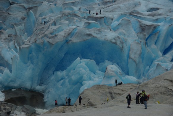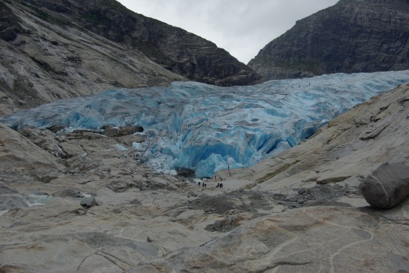 From the ferry port in Kaupanger, we only had half an hour to get to our hotel in Solvorn at the Sognefjord. The Walaker Hotell is the oldest hotel in Norway for nine generations now. It keeps a an atmosphere of the 1900s. The interior and the furniture, decoration and even the bed made you feel like your grand- or grand-grandparents. And the situation and view on the fjord is also very special. MJ stayed in the hotel and I made a trip to one of the side tongues of the largest glacier in Northern Europe, the Nigardsbreen. I first had to ride up the valley to the parking at the lake, then I took a little boat towards the glacier. However, in contrast to 25 years ago, I had to walk much more up. It was more than half an hour of climbing and walking over polished rocks before I reached the mouth of the glacier. I couldn’t get to the very last rock for my boots were no climbing shoes and the rock was very slippery.