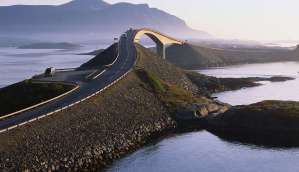 The landscape was still beautiful, although it was raining quite thoroughly. And there was already the next ferry in Vestnes. And an enormous queue. After waiting for ten minutes, the thing moved and we embarked the large ferry. We had come right on time, because we were one of the last to enter the boat, the rest had to wait for the next in 45 min. On the trip we had THE Norwegian snack: pølser aka hot dogs. After 35 min, disembarking also went very quick. I followed the signs for Atlanterhavsveien, the big highlight of today and the reason to go so north now. It is also known under the English name “Atlantic Road“. The signs guided us through farmland and along the coast.