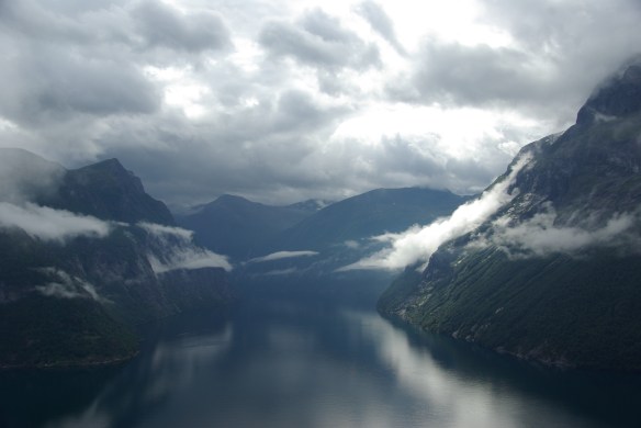 We headed north and as predicted, the drizzle stopped. It was a nice winding road between steep mountains. We reached the Sunnylvsfjorden and the fjord lived up to its name – a ray of light burst through the clouds. What a view!