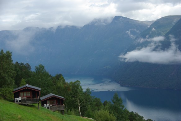 One the way down, we passed the waterfall at the Gudbrandsjuvet, but were too lazy to leave our cozy place on the bike. Down in the valley, we rode on the ferry to Eidsdal. Only a few minutes later, we continued on the last ascent for today. Still in nasty rain. The landscape was nevertheless beautiful, without the abundant clouds it would have been magnificent. Finally we got to the Ørnesvingen viewpoint with a panoramic view on the Geirangerfjord, another UNESCO heritage. The eagle road down to the fjord is one of the most spectacular roads in Norway. Some minute later, we arrived soaked on the outside, but dry on the inside at our hotel for today, the traditional “Utsikten Hotel”, or View Hotel, in other words. I had reserved something special: a rook with a panoramic view on the Geirangerfjord. The hotel might be in need of a refurbishment, the rooms are small, but the view on the fjord is fabulous. If you don’t have a room with a mountain view.