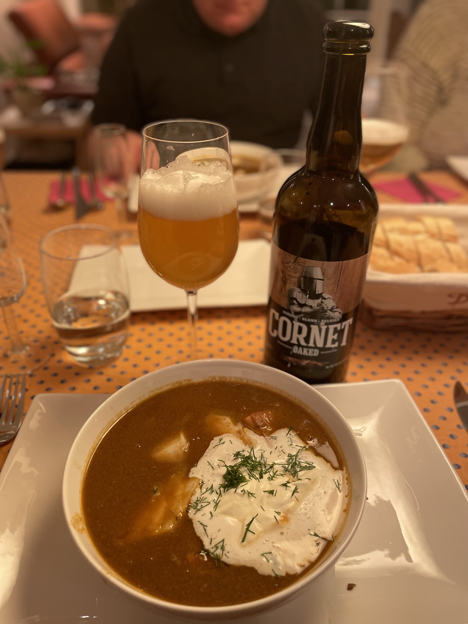 Another event that happened for the first time since 2019 was what was called in former times the “XBR Wintertreffen” (XBR winter meeting). Since 2003 I invited fellow motorbiking friends (linked to the XBR Alpentour events) for a meeting in March, accompanied by a yummy dinner. Since 2007, the meetings happened in Belgium; the mild climate allows to do a motorbike tour, often the first one in the year. This year, Jo, Hans, Ralf and Gernot made it to the meeting, Hans even made it on his Pan European. Using some of my bikes, we did a nice 100 km trip through Southern and Northern Brabant. In the evening, the motto of the dinner followed the typical pattern: my last journey. As my last trip went to Iceland, I tried to reproduce some of the nicest dishes I had enjoyed on the Island: sandwiches with aquavit, Humarsúpa (fish soup), slow cooked lamb and Skyr with fresh berries. Delicious.
