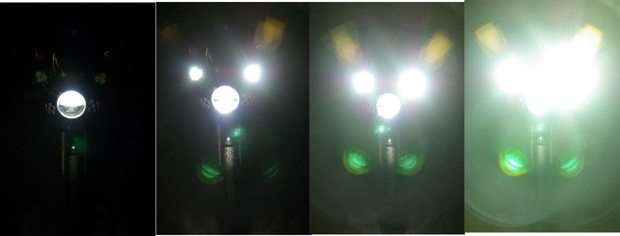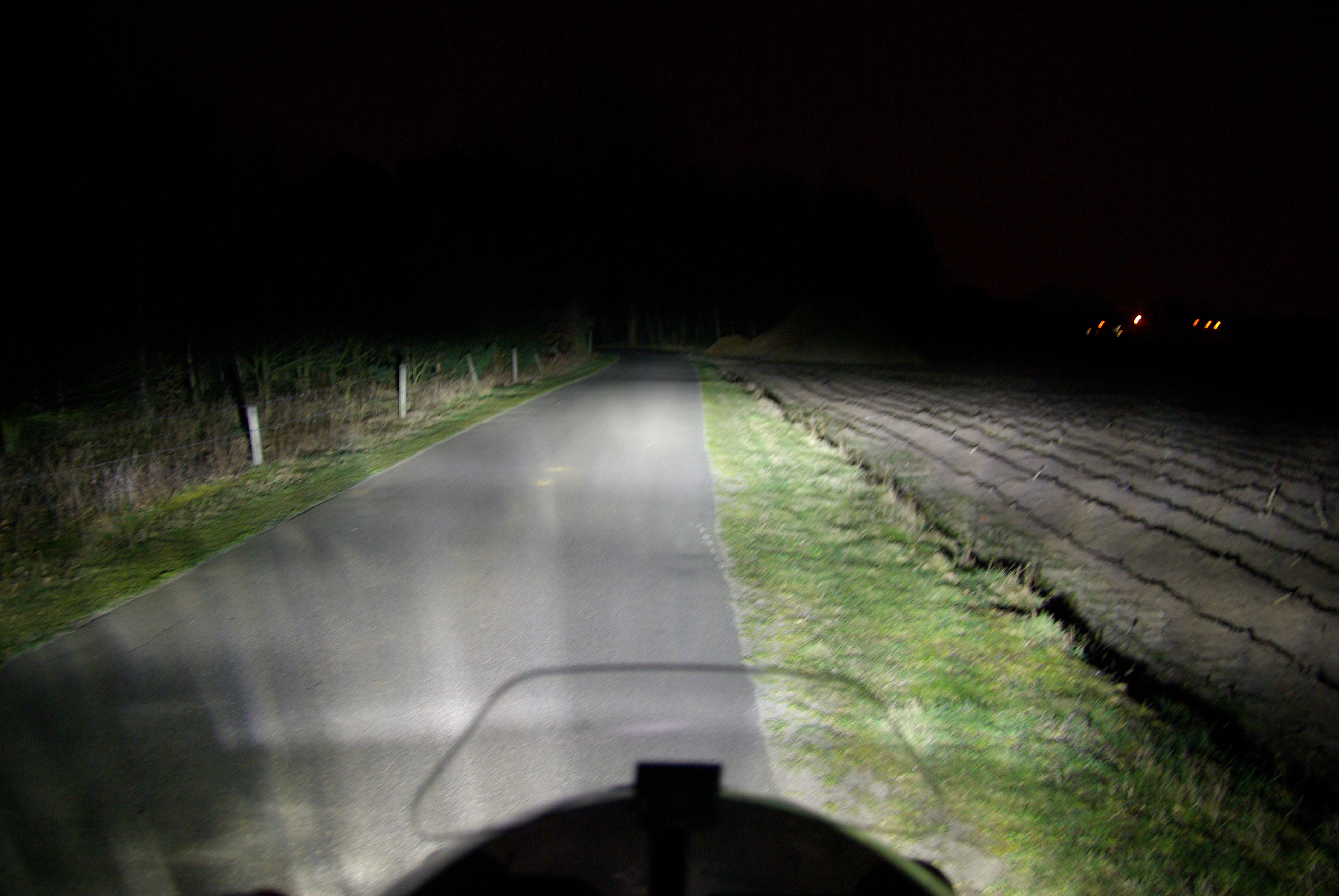 In the last post, I had no picture for the Krista auxiliary LED lights. I did a quick night ride test to take some pictures that demonstrate the massive light output of these flooders. During the ride, a rabbit crossed my way, its eyes were brightly glowing red as I had the Kristas on full power. Probably its retina was melting in this moment…an impressive sight. It gives some piece of mind knowing that I can detect the critters a lot earlier before they jump on the road.