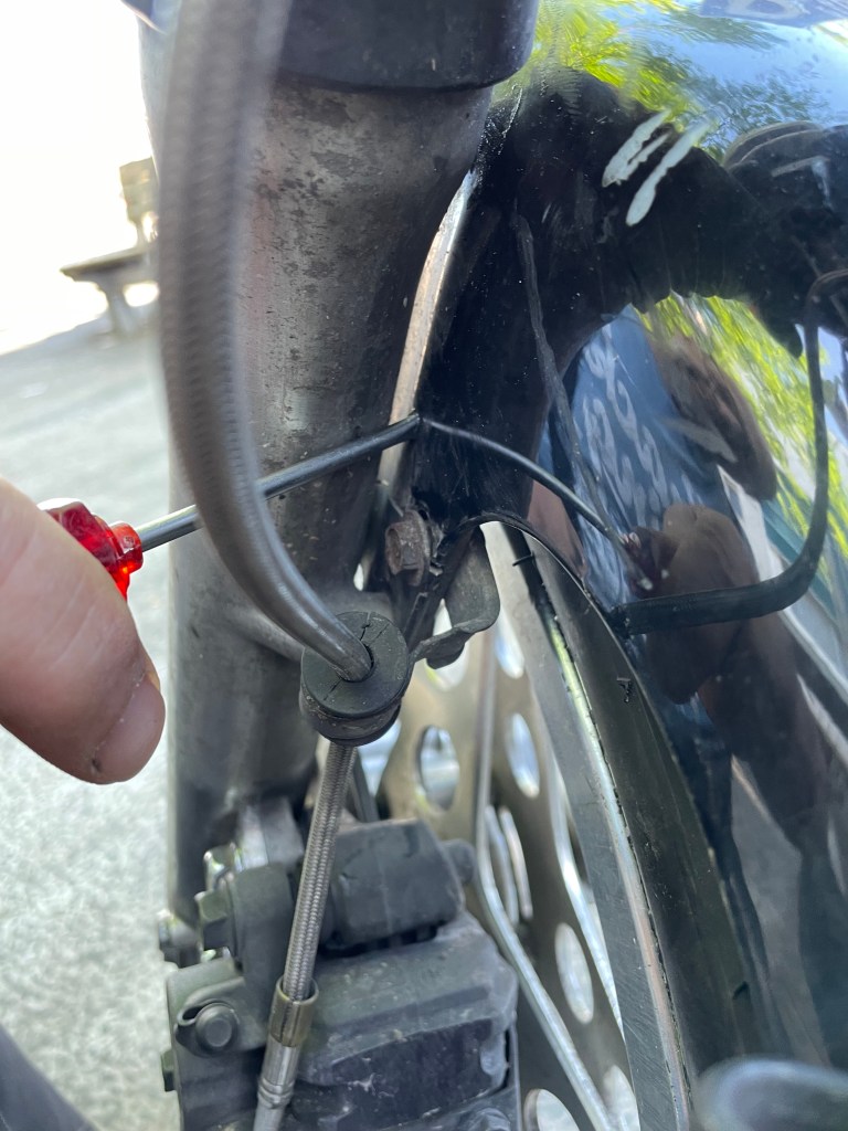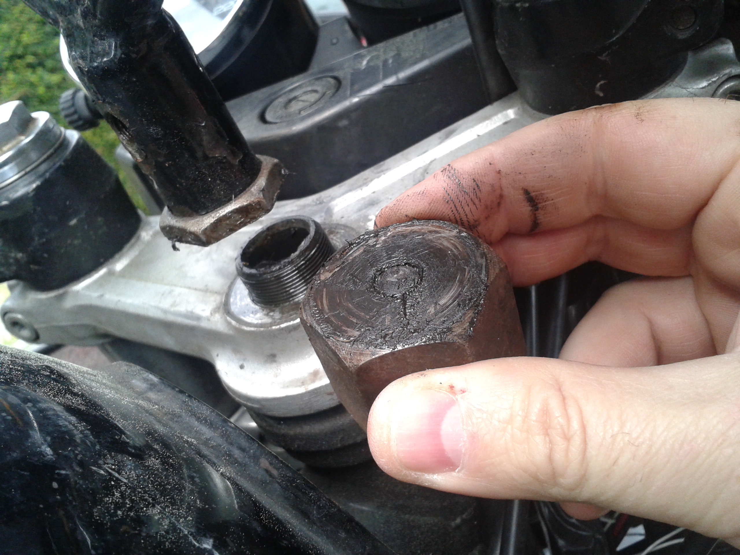 Broken steel pin that holds the upper fairing in its place.