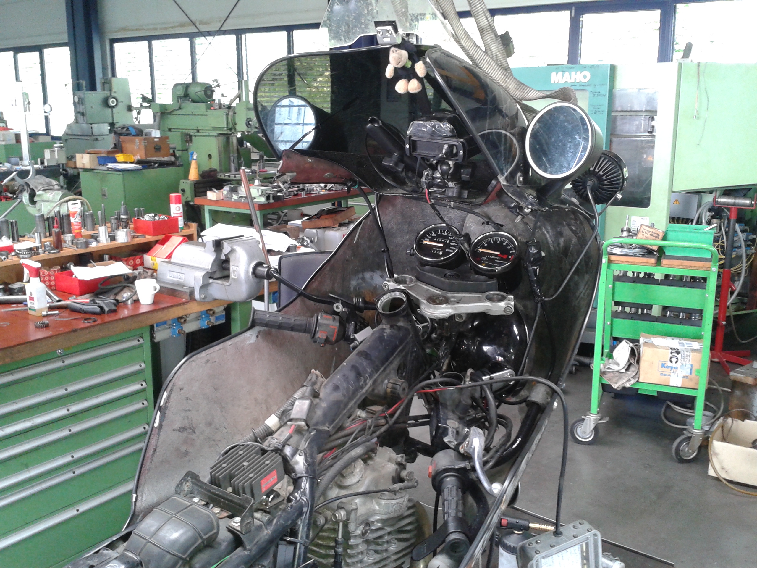 I had noticed before, that the XBR showed some strage behaviour when rolling slowly. I checked the steering head bearing – and was scared stiff! The bearing showed clearly a notch in the middle position. And yet another moment when disaster strikes…A nightmare! 10 days to go and I have to change the bearing! But it’s not as simple as that…it was a Emil Schwarz bearing that Mr Schwarz had installed two years ago. The particularity is that the bearing is not driven, but glued into the steering head. This is the best you can get for your bike in terms of bearings, but an exchange is not a piece of cake….I had an idea…I called Mr Schwarz the next day and explained the problem. His garage was on the way back home…I must have had some convincing arguments…and in the end he proposed to change the bearing the next day, on a Sunday morning! This was fantastic news! The next moning, after an early departure, I stood in front of his garage and he took immediately care of the XBR. During the next four hours, I had to cope with his bad temper as he hadn’t expected the fairing. It was difficult to work and after ruining a puller, he was pretty angry. I decided to shut up and in the end, Schwarz’ mood had improved and he listened to my plans, grinning and waging his head. Finally the bearing was changed and I could happlily continue my journey back home.