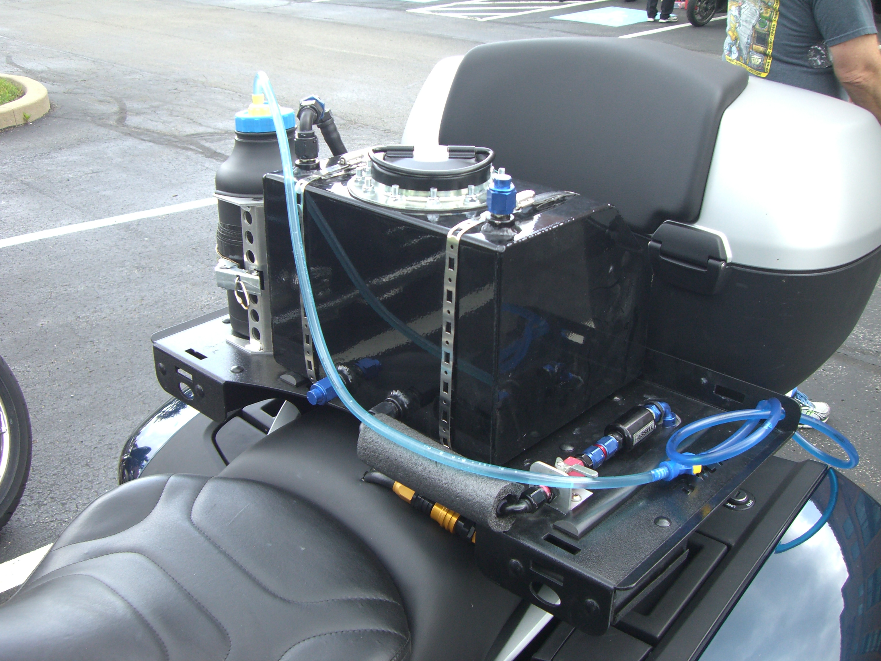I mounted the auxiliary fuel tank again, together with the little puke tank and the vent tube. The whole system worked very well on my BMW during the last two years and is very reliable.