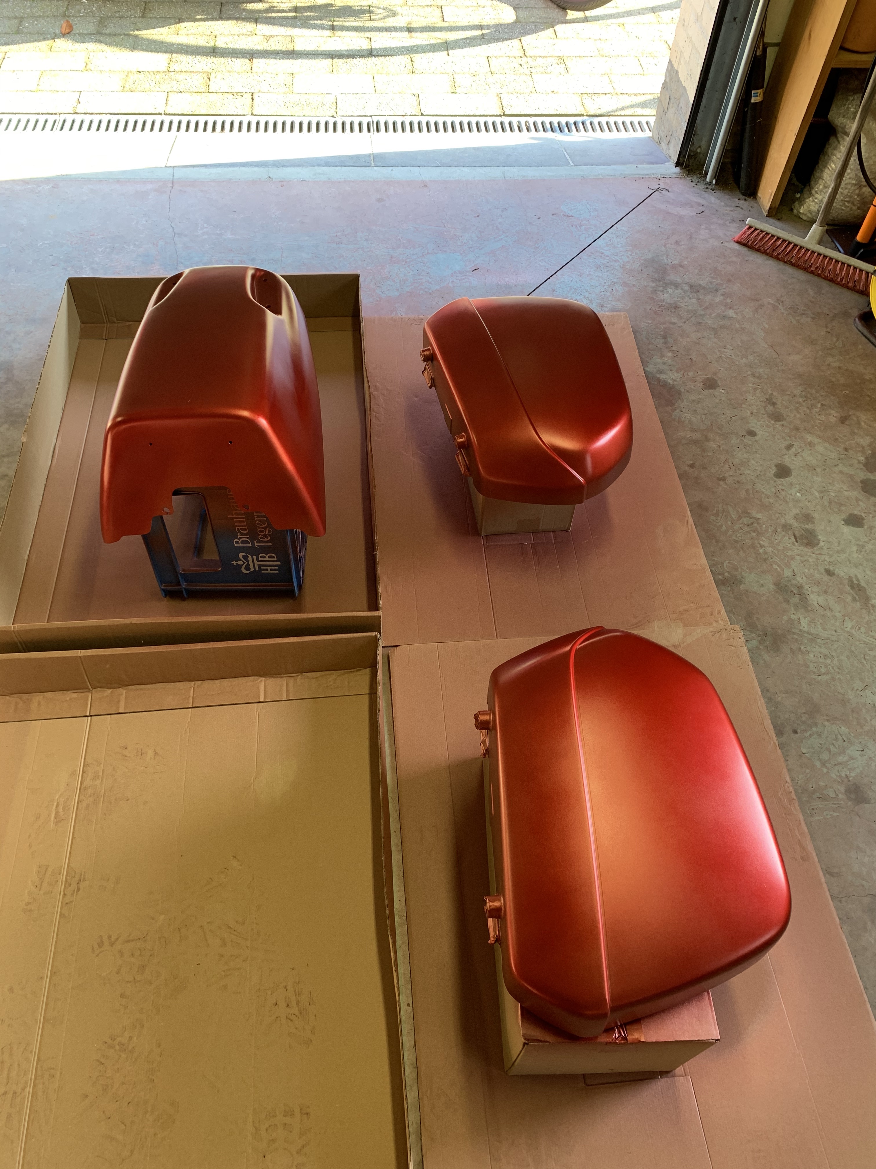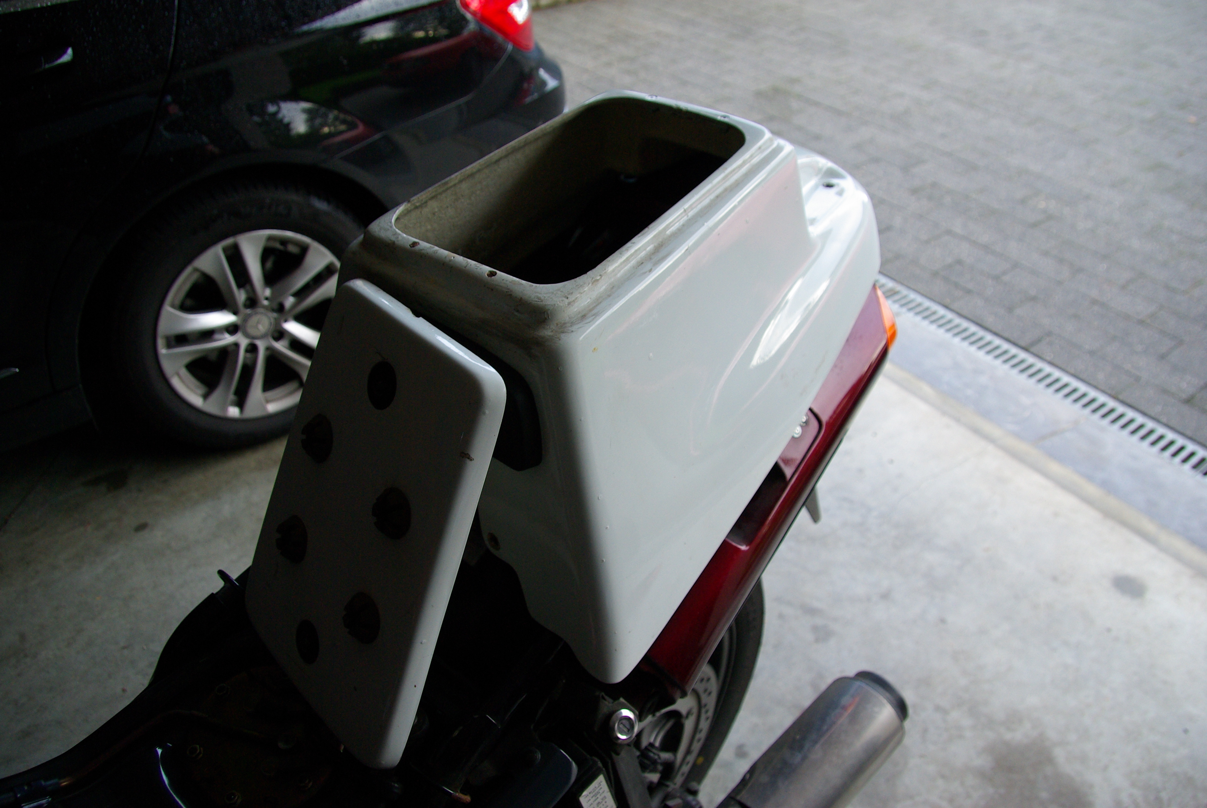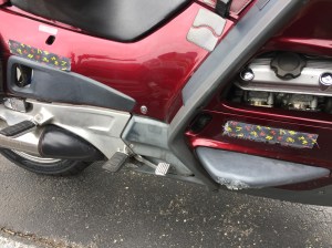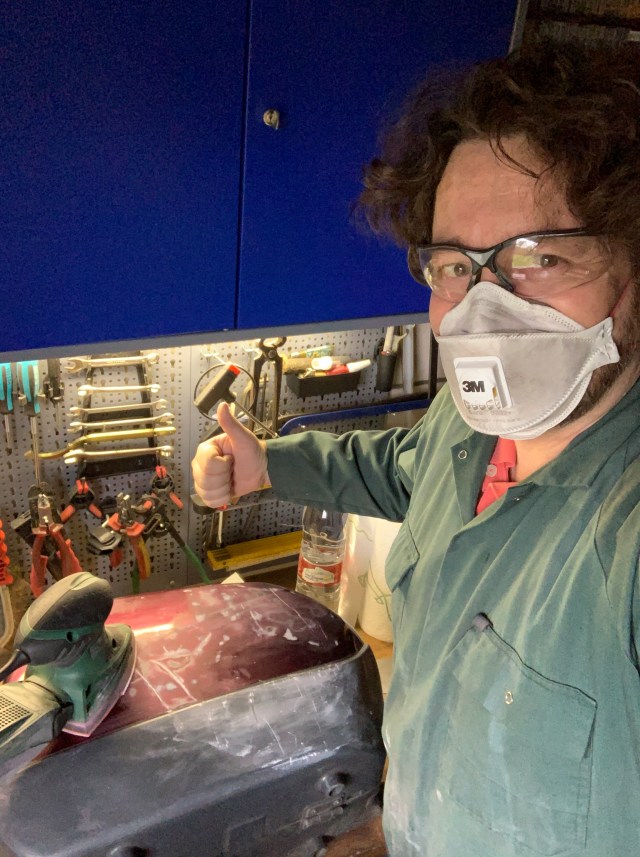 It was also a test ride with my new Russell seat that has arrived this morning from California. Wow! It not only looks big, it IS enormous. But what a comfort! I only rode 215km today, but this felt very, very comfy. I even didn’t get a comment about the Bol d’Or handlebars I had mounted replacing the original ones. My seating position is more upright and relaxed, not to speak of the new seat. Now I just need to put back the fairing and I’ll be in LD heaven :-) . Well, in the meantime I was painting the fairing: grinding, two layers of primer, one layer of black (all applied manually) and then one layer of sprayed black – and then the disaster happened – the freshly applied layer wrinkled within seconds!!! All the hours of work for nothing…I ground the wrinkles after drying, but I have a 3D painting now. Whatever, not everybody has such a unique fairing, ehem …The reason was most likely that the first black layer was not dry enough and/or the two paints were not compatible.