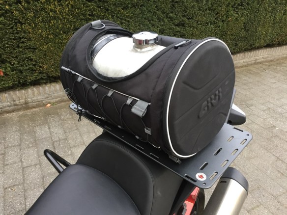 Another major improvement was to build a mount for my auxiliary tank to push the bikes fuel capacity from 20 L to 37 L. I had the tank mounted to the XBR in 2013 Iron Butt Rally but I used a different amount in the past. As this amount was not available anymore I had to make a new one. I decided to apply my dodgy welding skills to construct a basis where the tank could be mounted on. The whole thing would go on my rack in the back of the bike where normally my big 80 L aluminium box would be placed. I still had some iron lying around and started to construct what looked like a hashtag and welded it together. In the end the whole thing seemed to work and after I had connected the fuel line to some new connectors that combined the old and the auxiliary fuel line together. I also invested in a few more farkles such as a new GPS holder and was quite happy with the result of all the transformation.