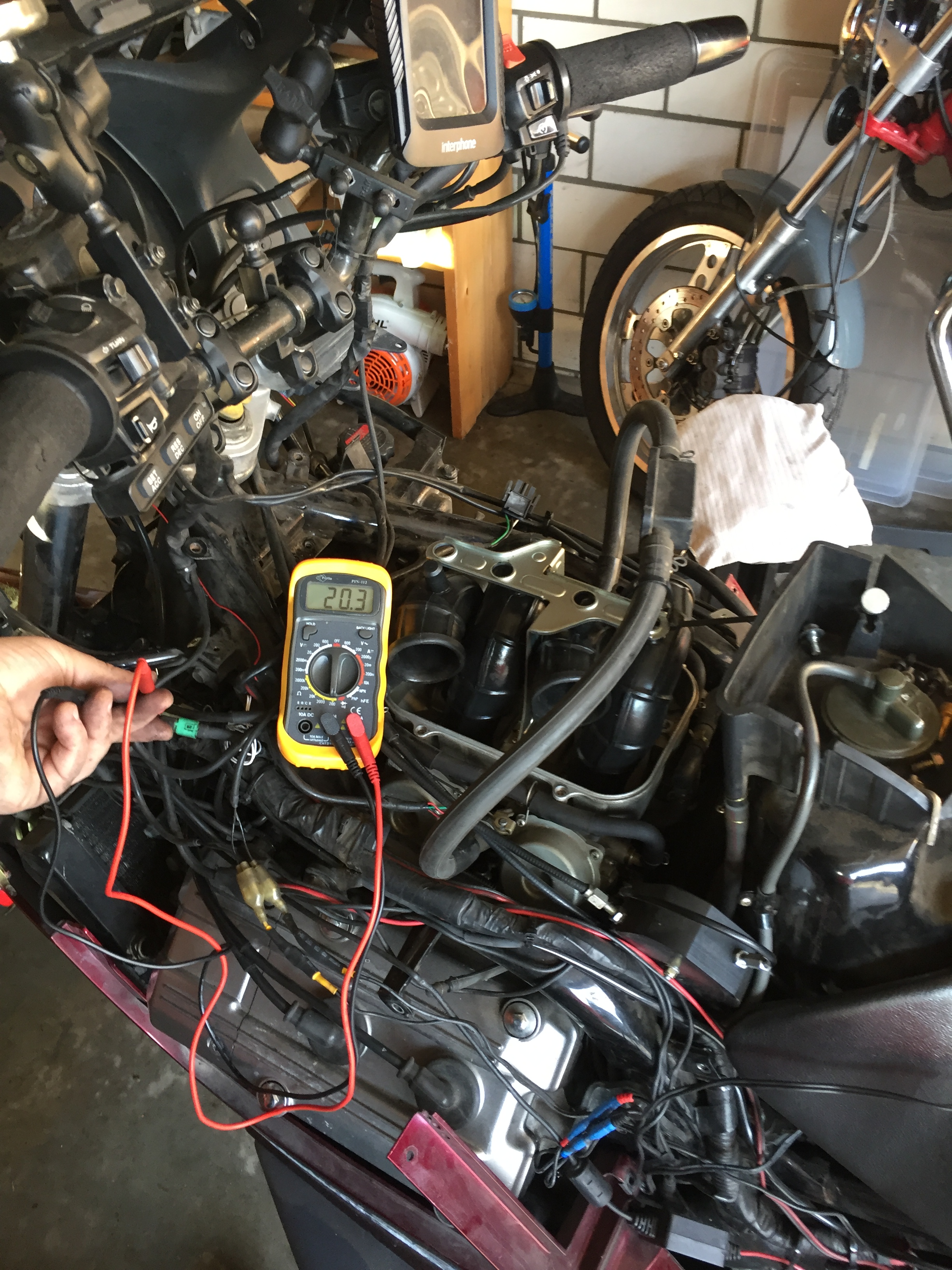 The bike has received a fork oil change with more viscous oil (what a difference!) and a last-minute oil change. After 2500 km of error messages, the Zumo 660 stopped showing these messages when I went to the Sat Nav shop this evening. Spooky. I discovered the problem for non-charging of the new Zumo 350: a broken ground (!) cable.