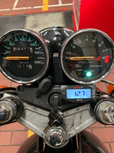 The main display shows the time (not needed here, but useful), the temperature (very useful, I have attached the temperature probe to the oil hose to monitor the oil temperatur and hopefully prevents engine breakdown in the soring heat of the desert ) and the battery voltage (veeeeery useful, it gives me valuable iformation about the condition of the battery). The latter is needed to check if the electrical system is in good health. It does not substitute a proper measurement of the charging current that I will do at a later stage to investigate if the alternator produces enough energy for all the electrical appliances, but it is a good indication. Remember, the max. output of the alternator is only 170 W. A 2012 R1200GS Adventure has an output of 720 W, that’s 4 times more! I have connected a lot of additional farkles and heated garments are not possible to use. The additional Krista lights draw most of the power and have to be used wisely. Another advantage of the Display 1 is that I can easily switch off the devices, even during riding. This means I can use all farkles while riding with low beam and switch off the ones with an internal battery when I need full lightning power at night on winding roads. As I said, I need to measure the exact uptakes and their effect on the total power using a clamp meter.