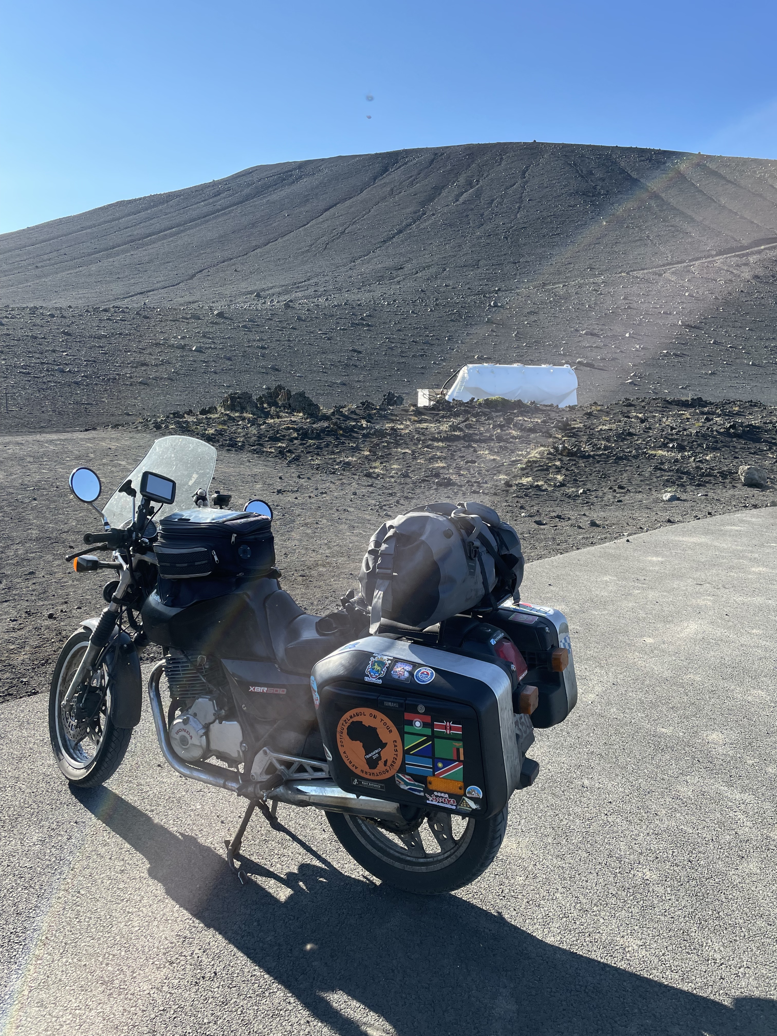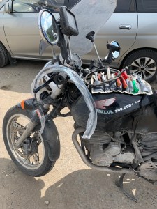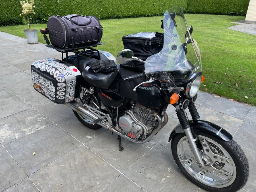 When I discussed the subject with Mart!n, I argued that it would be a pity to cut the fairing as it is so rare…and his pointed remark was: “there’s a reason why”…hmpf. John commented my action as “I’m glad you’ve done this as I was seriously concerned that your bike would have seized crossing the desert”. Well, I save 2 kg on the front, the XBR should be easier to drive now. Finally I had access to the motor and I could change the spark plug and adjust the valves. And as a last preparation, the bike was cleaned so everything should be prepared for the drop-off.