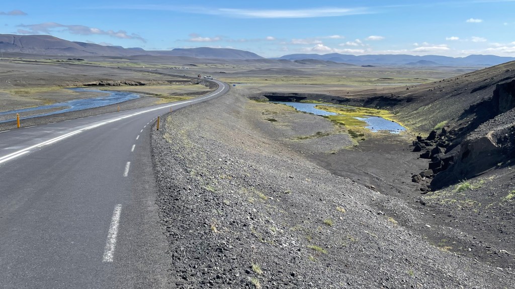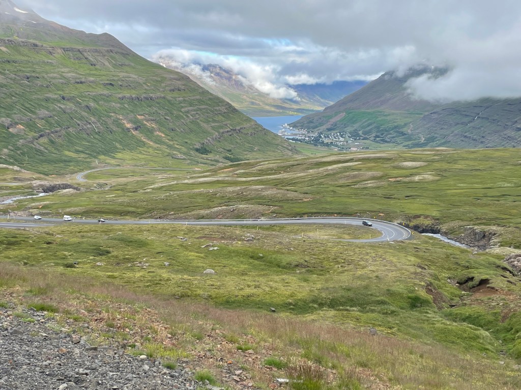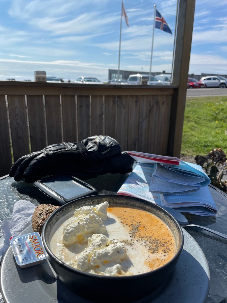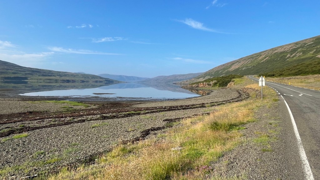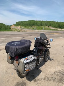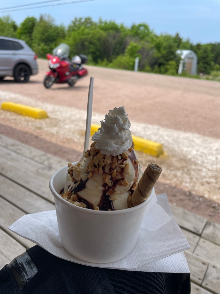 I turned around again and went back to the Cabot Trail main road. I reached the west coast which turned out to be very different from the eastern side. The temperature was lower and it was more windy. The aspect was more maritime as the eastern side is more protected. I stopped at a viewpoint that informed me that this was a large geological formation – the Aspy Fault, a large rift that separates the north of the National Park of Cape Breton. Down at the coast. I felt a bit peckish, but food places were rare. Finally I stopped at a souvenir shop, mainly because it said “biker friendly”. I browsed the merchandise and acquired a T-shirt of the Cabot Trail of an acceptable design. I also purchased my lunch, aka icecream.