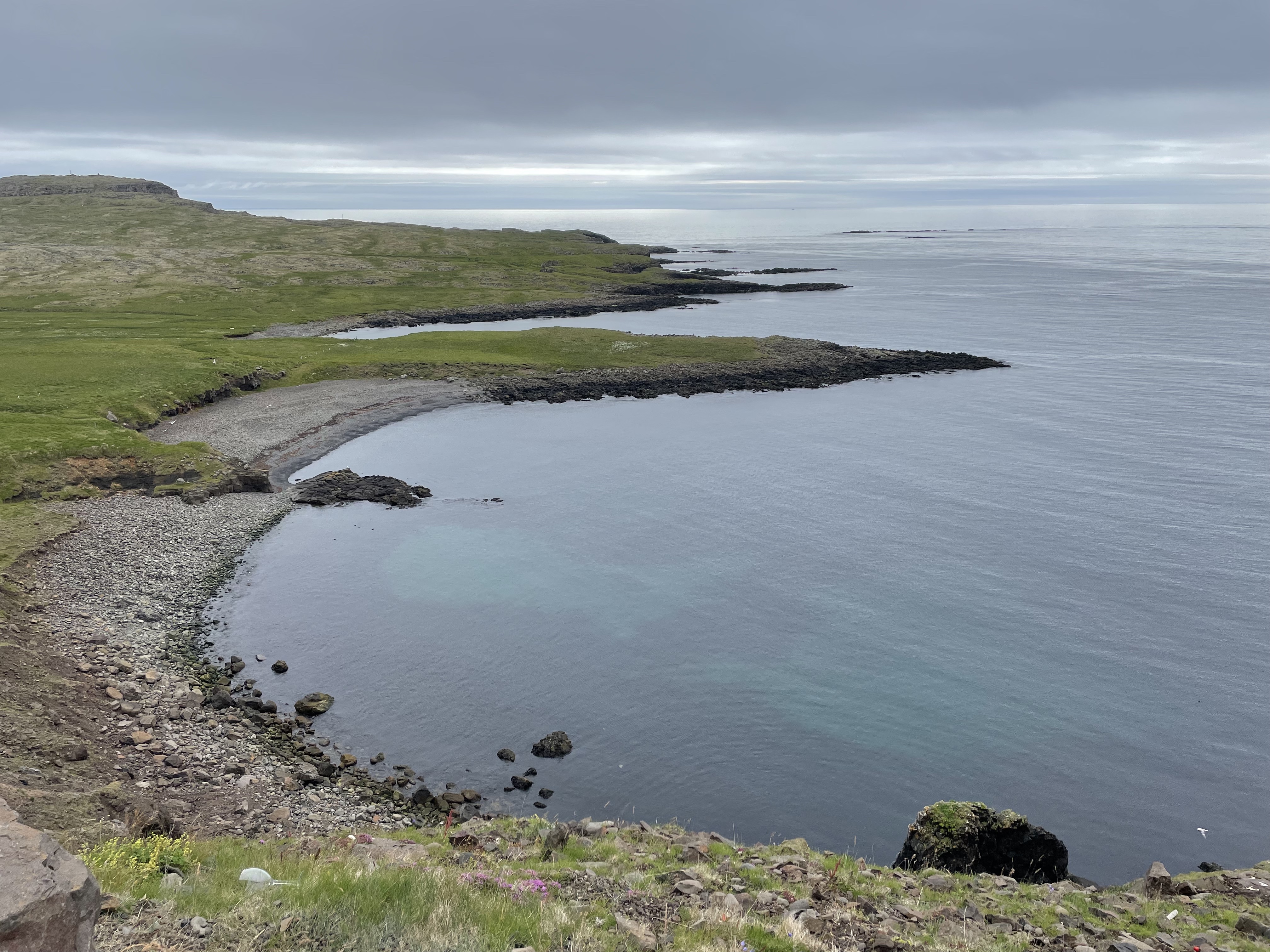I returned to the main road and decided to fill up to give me some peace of mind for the rest of the day. To my surprise, only 16 litres fitted in the tank which means that the consumption is quite low (5.5 L/100 km; 43 mpg). I headed north to the northernmost tip of Cape Breton next to Bay Saint Lawrence, a small fishing harbour. I tried to ride to a remote lighthouse, but after 2 km the gravel road turned into a footpath. Well done, Google Maps! I turned around and tried to follow the coast in the opposite direction towards Meat Cove. I did not ride the whole way, only until I had enough of the gravel road and had taken enough pictures of scenic views.