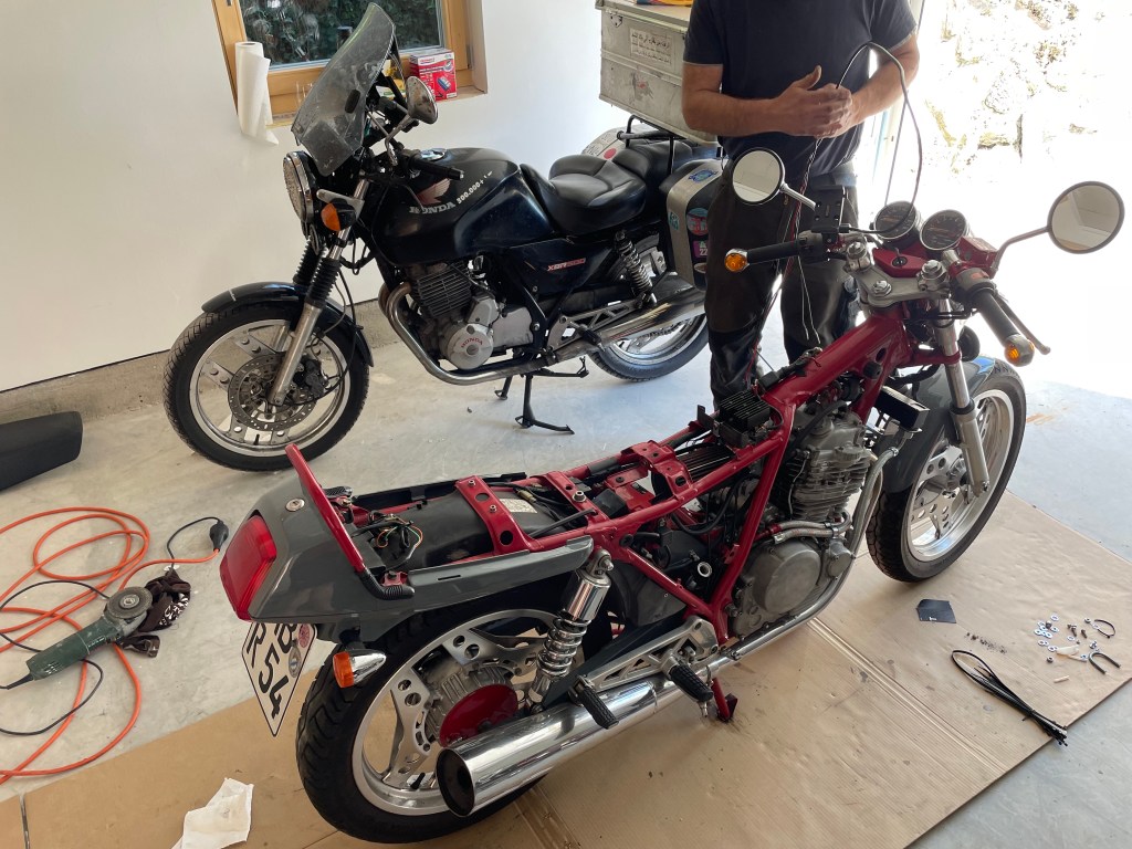 Today was the day of last preparations. I had taken a difficult decision: The lower part of the fairing had to be cut off. A very, very painful decision, but I saw no other choice but to do this. My legs would be burnt and the motor would collapse in the heat. When I rode at 25°C a week ago, my legs were getting very hot. So I took the electrical saw and…..