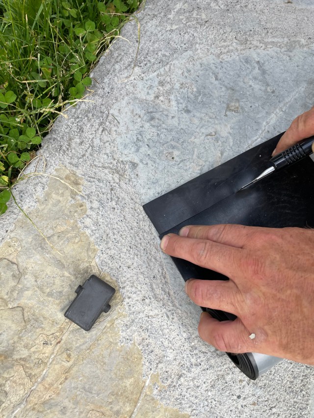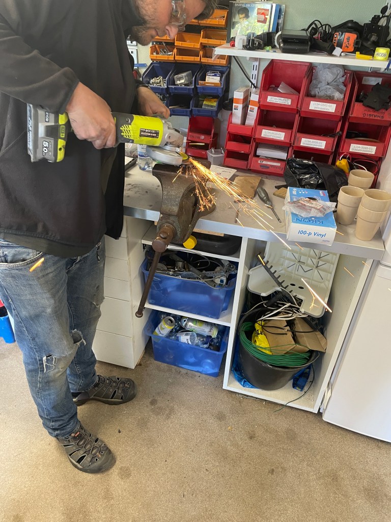 What could I do? This was the end for the Brit Butt Rally this weekend, wasn’t it? Maybe I could remove the fairing….or try to fix the auxiliary tank to the BMW in a night-shift and leave with more Boxer power? But maybe there was still hope….I would pass by the house of Heinz, the magical mechanic. Maybe he had an idea. He had helped me two days ago to get my baggage rack welded, what a relief! But this would be too delicate to fix….Let’s give it a try. I met Heinz in front of his house, walking his dog. I expressed my frustration and we investigated the problem. The pin was actually a kind of screw that was screwed into the large nut. Heinz is a man who likes challenges and he immediately was looking for a solution. He drilled out the remaining bolt with the thread and looked for a larger screw that he could transform into a bolt. He luckily has a turning machine…and he can do miracles with it!