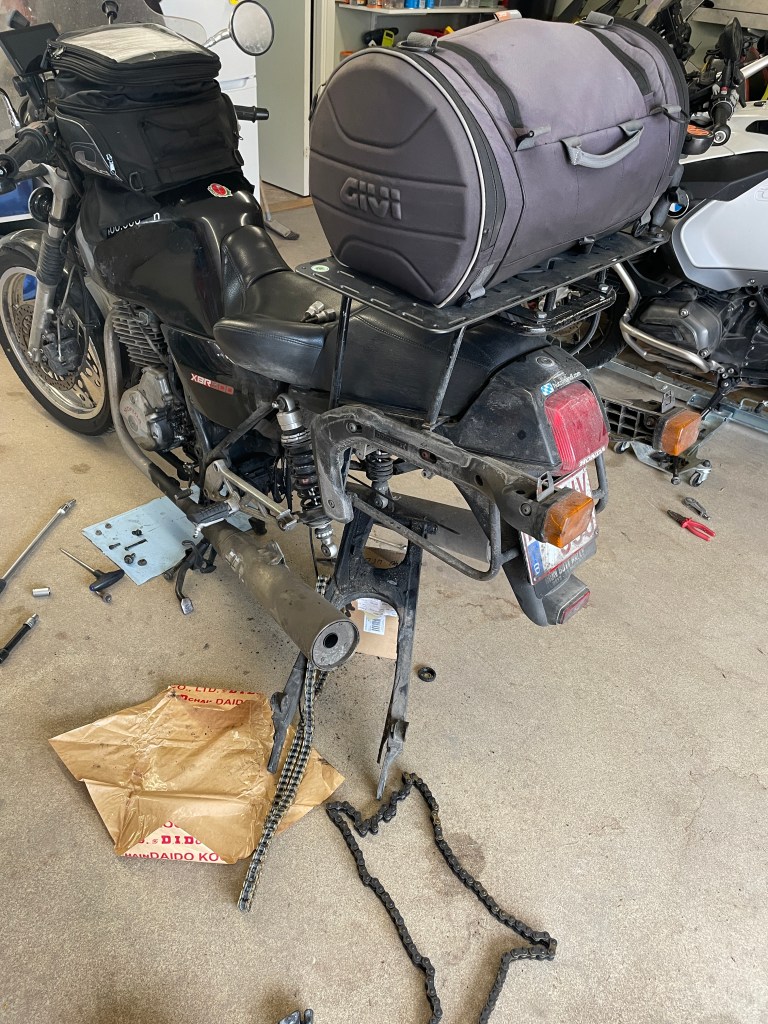 This was exactly what I wanted to know and I’m looking forward to the Brit Butt Rally next week. The only technical problems were the odometer and the overflowing carburetor. In the meantime, I realized that the root cause for the damage speedometer gear was the cable. I have cannibalized the caferacer XBR for the time being and the speedometer is fine again. I have opened the carburetor (seemed to be clean) and I have installed a petrol filter. A new rear tire was installed and a problem was detected: When I removed the auxiliary tank (I wanted to move it a bit to the front), I realized that two bars of the holders were broken.