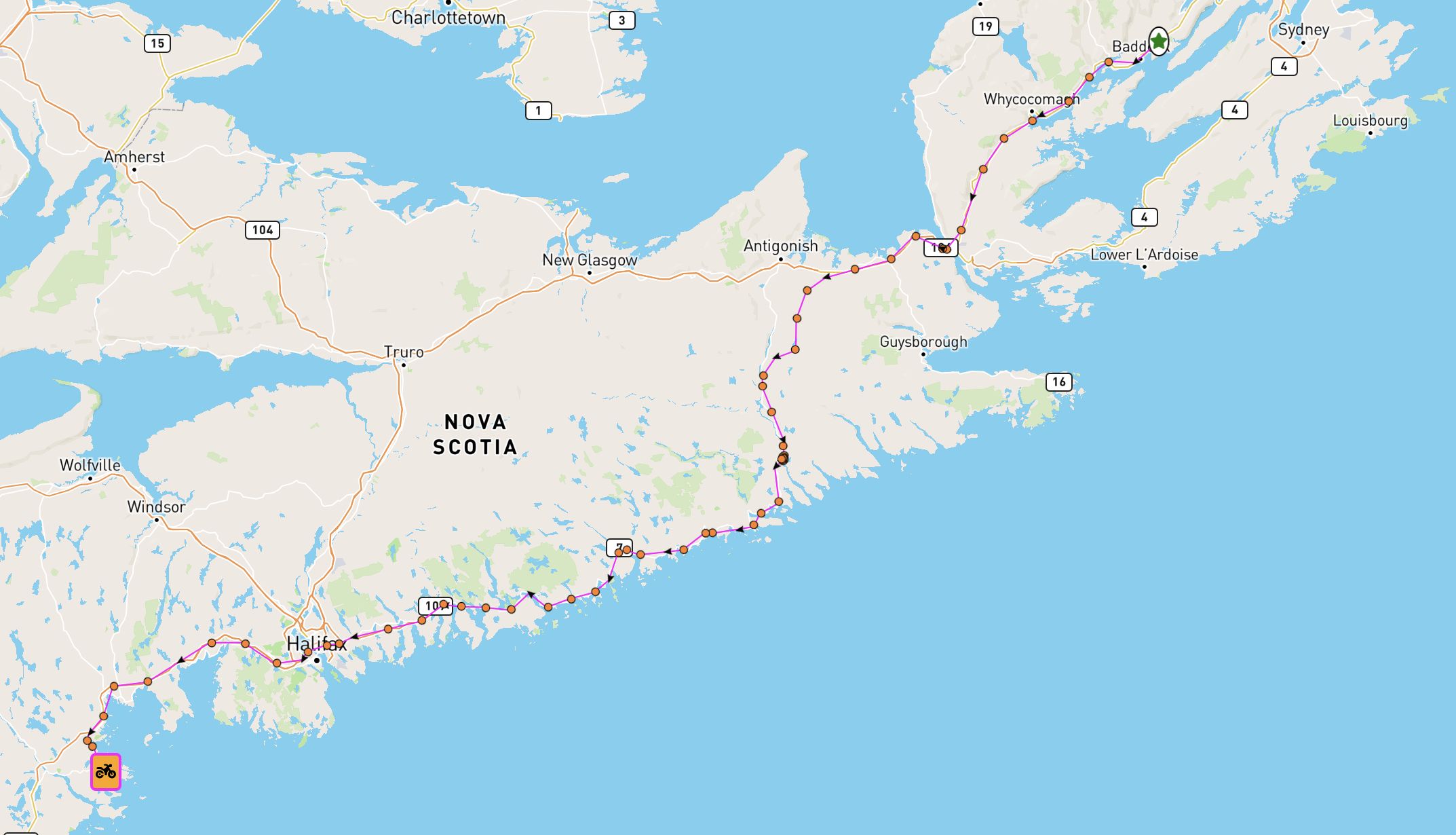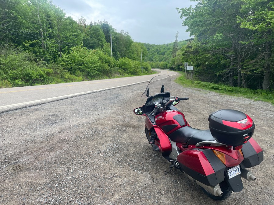It was not that easy to find a place that rents motorbikes in Nova Scotia and ultimately there is only one place – Brookspeed Motorcycles in a remote location east of Truro. I reserved well in advance and the challenge was rather to organise the transport from downtown Halifax to there which was 70 min away. In found also a solution for this by arranging my first ever Uber ride. I had an entertaining chat with the driver from Ghana who dropped me off at 9:15 in the morning. Nigel the owner was already waiting and the bike, a Honda ST1300, was already waiting for me.