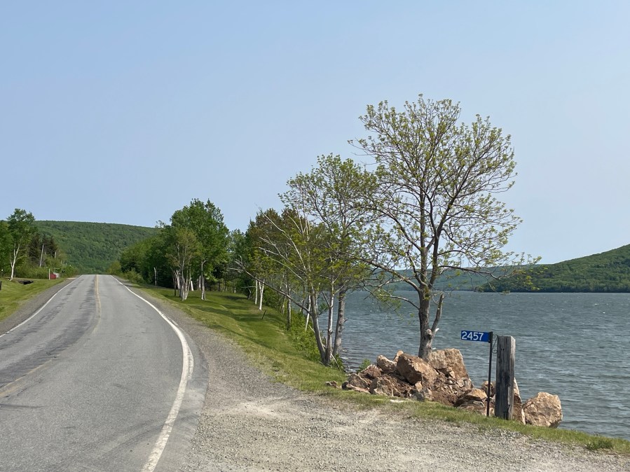 In Antigonish I stopped at a Tim Horton’s for a sandwich and something to drink. A short break, the plan of this trip is to have a relaxed ride, to have a break from all these rides under time pressure. I crossed the Canso Strait and entered Cape Breton. I decided to ride on the West Coast. In general, there is a lot of nature, few houses and little infrastructure. In a way it is comparable to rural Scotland or Northern Scandinavia. I made good progress as average is decent, despite the low speed limits: as there are no towns and no traffic, riding speed is constant. In Mabou, I decided to fill up early, as petrol stations are scarce. I went up further north until I turned eastwards, I had plenty of time on my hands today, although I had to arrive before 6 p.m. at my hotel today. I passed Lake Ainslie until I reached Whycocomagh at an arm of the Lake Bras d’Or, a large estuary in the centre of Cape Breton, a UNESCO biosphere reserve. The views on the lake are quite nice and when I reached Baddeck, I expected a large touristic town. Well, it is touristic in a way, but much smaller than expected. You see a lot of names in Gaelic on the island, including all the town names. The roads I was riding on today had poetic names – the Sunrise Trail, the Ceilidh Trail…the largest one is reserved for tomorrow/ the Cabot Trail.