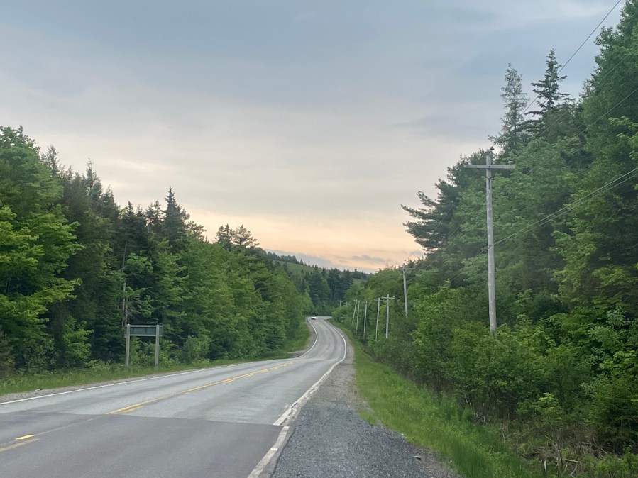I was wondering which route to take in the morning in order to avoid a rain front. But as the rich breakfast and the following chat with the owner did take longer than expected, it did not matter anymore – the rain had started. Well, it didn’t matter then. I started off in the rain shortly after nine and headed for Baddeck and further southwest. The rain stopped after 30 minutes and I enjoy the easy ride on highway 105. Just after leaving the island of Cape Breton, I filled up and cleaned the windshield. My plan was to head for the east coast and to cross Nova Scotia at the southern shore. The sky was cloudy and I still had to pass a strong shower, but this would be the last time today. The area was lush with farmland and small forests.