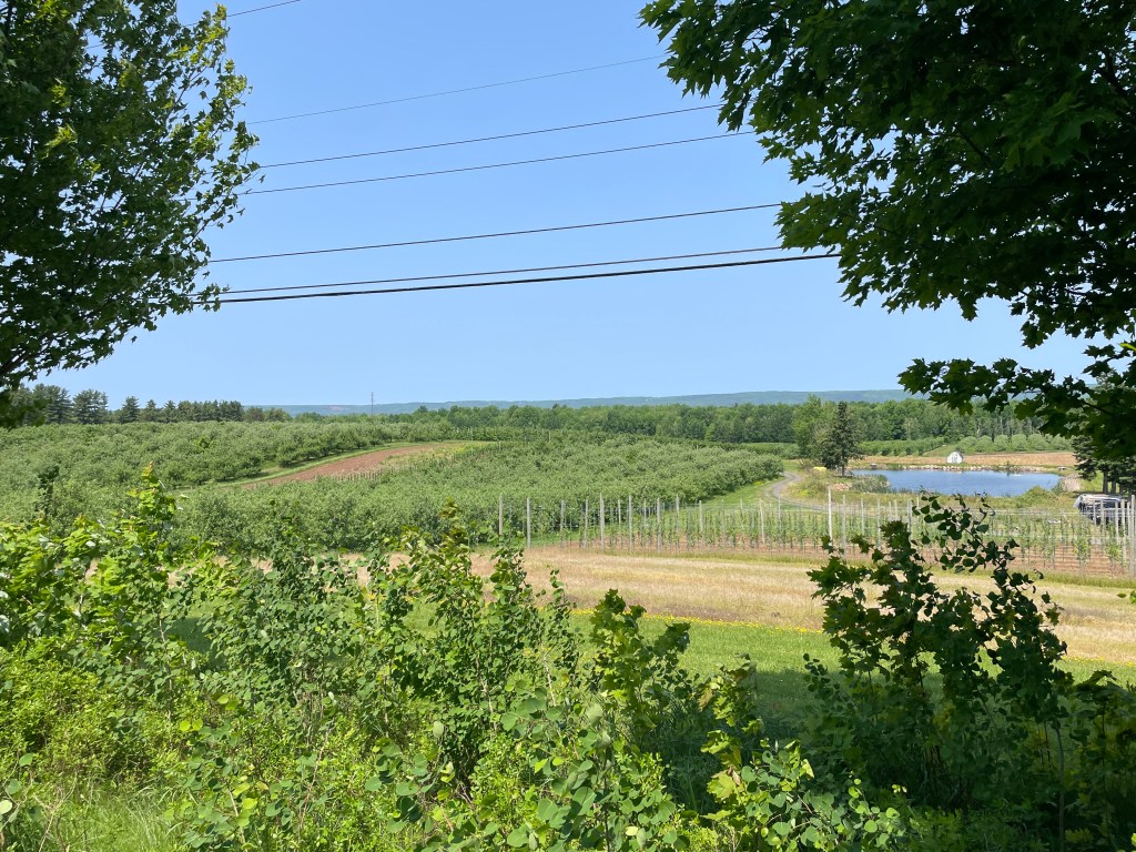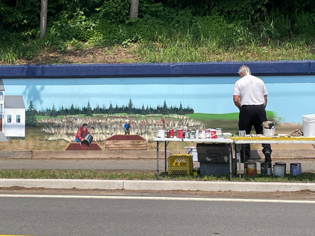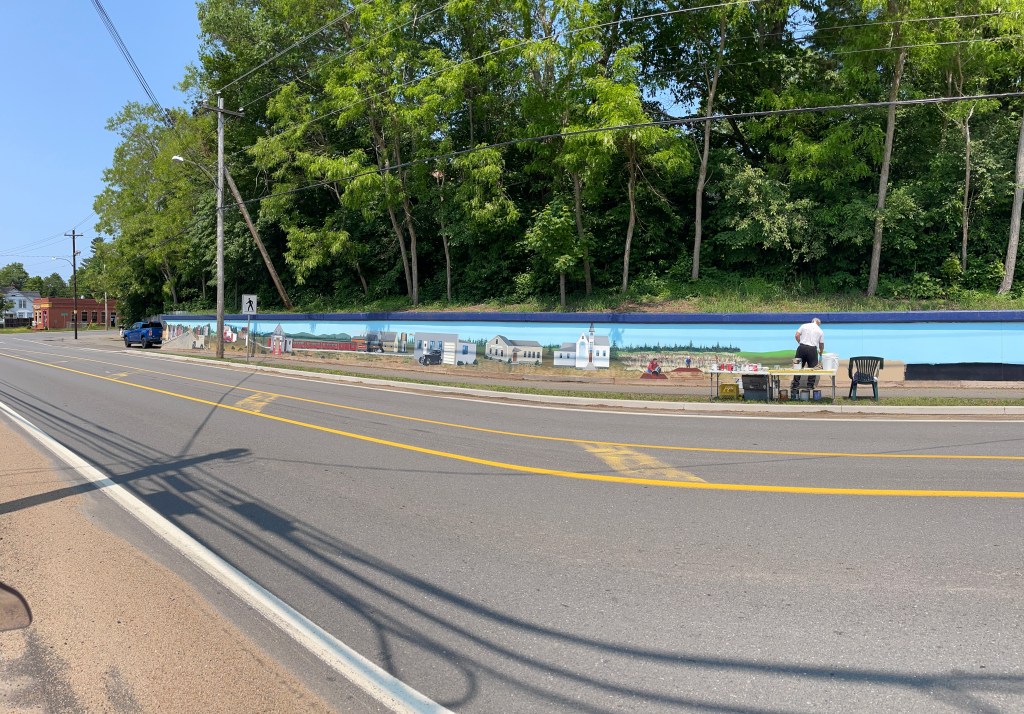 I was entering Annapolis Valley, supposedly one of the highlights of Nova Scotia. I avoided the Highway 101 and chose the smaller Highway 201 that lead through lush fields with scattered farms. It has one of the mildest microclimates and is known for its fruit and vegetable crops. I enjoyed riding with the humming ST1300, the sunny weather was also playing along. I stopped here and there, taking pictures. In one village, I spotted a painter that was painting an enormous mural in great details – impressive.