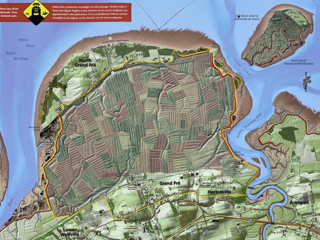 In Kentville and Wolfville, the area got more urban, quite a wealthy area, it seems. My next stop was at Grand-Pré, a national historic site. The Grand-Pré National Historic Site is a park set aside to commemorate the Grand-Pré area of Nova Scotia as a centre of Acadian settlement from 1682 to 1755. The French settlers built dykes to hold back the tides along the Minas Basin. They created rich pastures for their animals and fertile fields for their crops. Grand-Pré became the bread basket of Acadia, and by the mid-18th century was the largest of the numerous Acadian communities around the Bay of Fundy and the coastline of Nova Scotia.