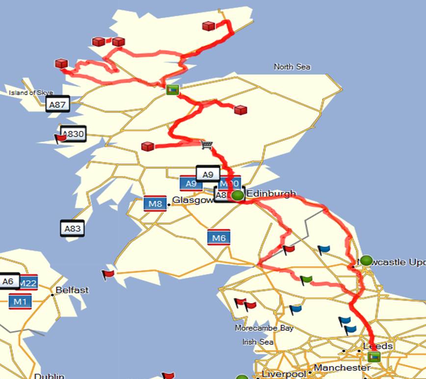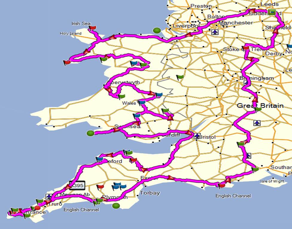 At first sight, there were two options: a route to Wales and Cornwall or a northern route to Scotland. Only a thorough calculation can reveal which is the winning route. The southern route contained 30 bonus point locations, 1600 miles in 34 hours, good for 25990 points. Hmm, very challenging. Lots of small roads, many stops and many tourists on the road. What was the alternative?