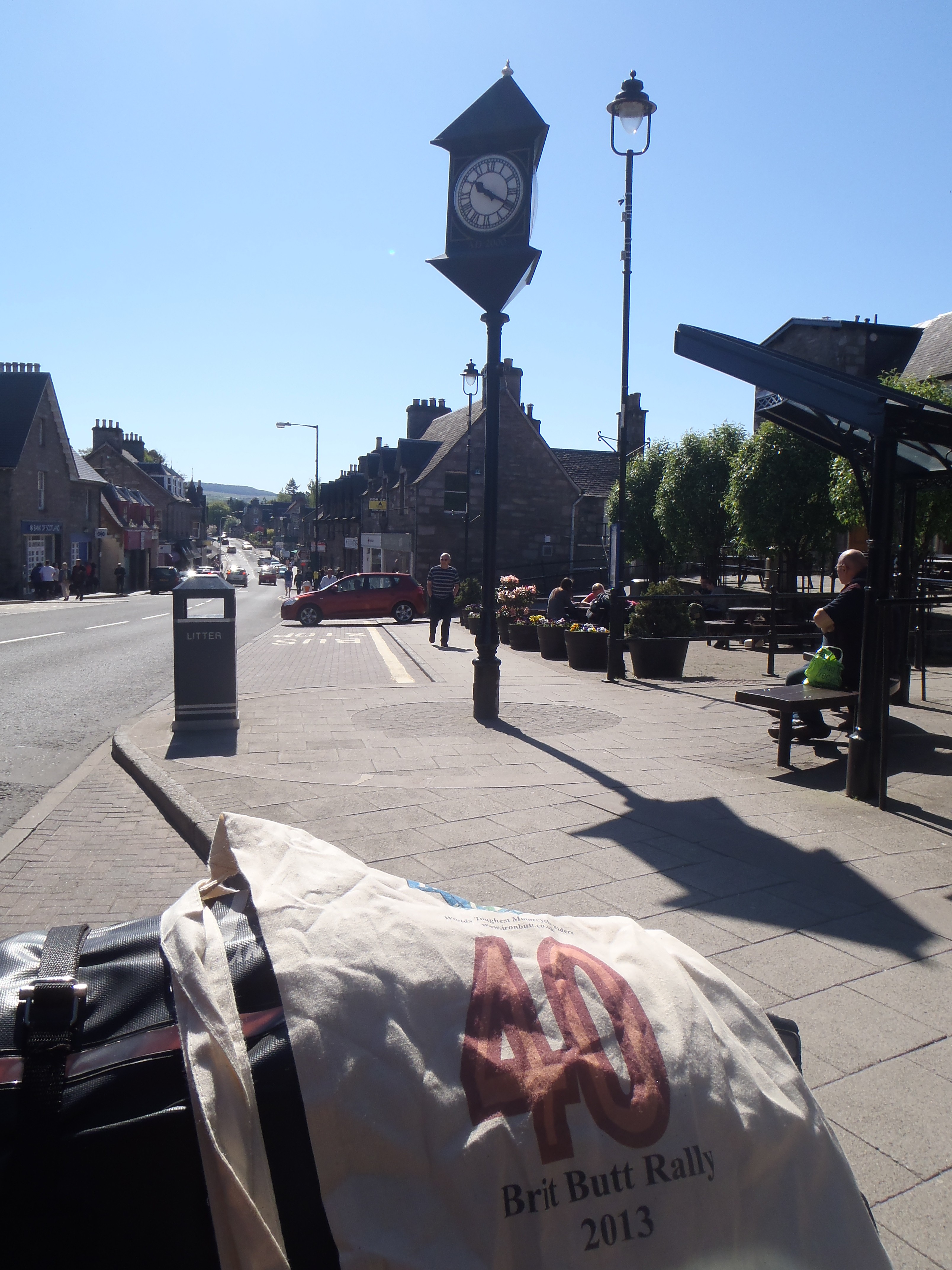 I grabbed my flag, the camera and the pink balloon and asked a lady to take a picture of me. In other countries this sight would puzzle the bystanders and such a request would be responded with a certain confusion. But not in Britain…I mounted by steed and went back to the junction at the A90. On the other side of the red lights, I saw Rob Roalfe waiting. I waved at him and I could sense the startled look on his face. So the decision to take the A1 wasn’t that bad at all. What I learned later was that he had visited another, smaller point. But for me it was top priority to get to Cramond Island at low tide. Well done. The next point would be at the north-western coast of Scotland, still a long way to go. But there was this timed bonus at 10:20 a.m. when I had to take a picture of a public clock. While riding northbound over the Firth of Forth and with the help of my sat navs, I tried to locate the best spot for this. Perth? No, too early. Pitlochry? Hm, also a bit too early, but chances were slim to find a clock north of Pitlochry. So Pitlochry it had to be. I could use the time and put in some petrol, although it was still a bit early after 370 miles. I first went to the centre of Pitlochry and found a clock right away. I turned around and went back to a petrol station I had passed. Back at the clock, I had still a couple of minutes to wait. Finally, it was 10:20 a.m. and I could take the picture.