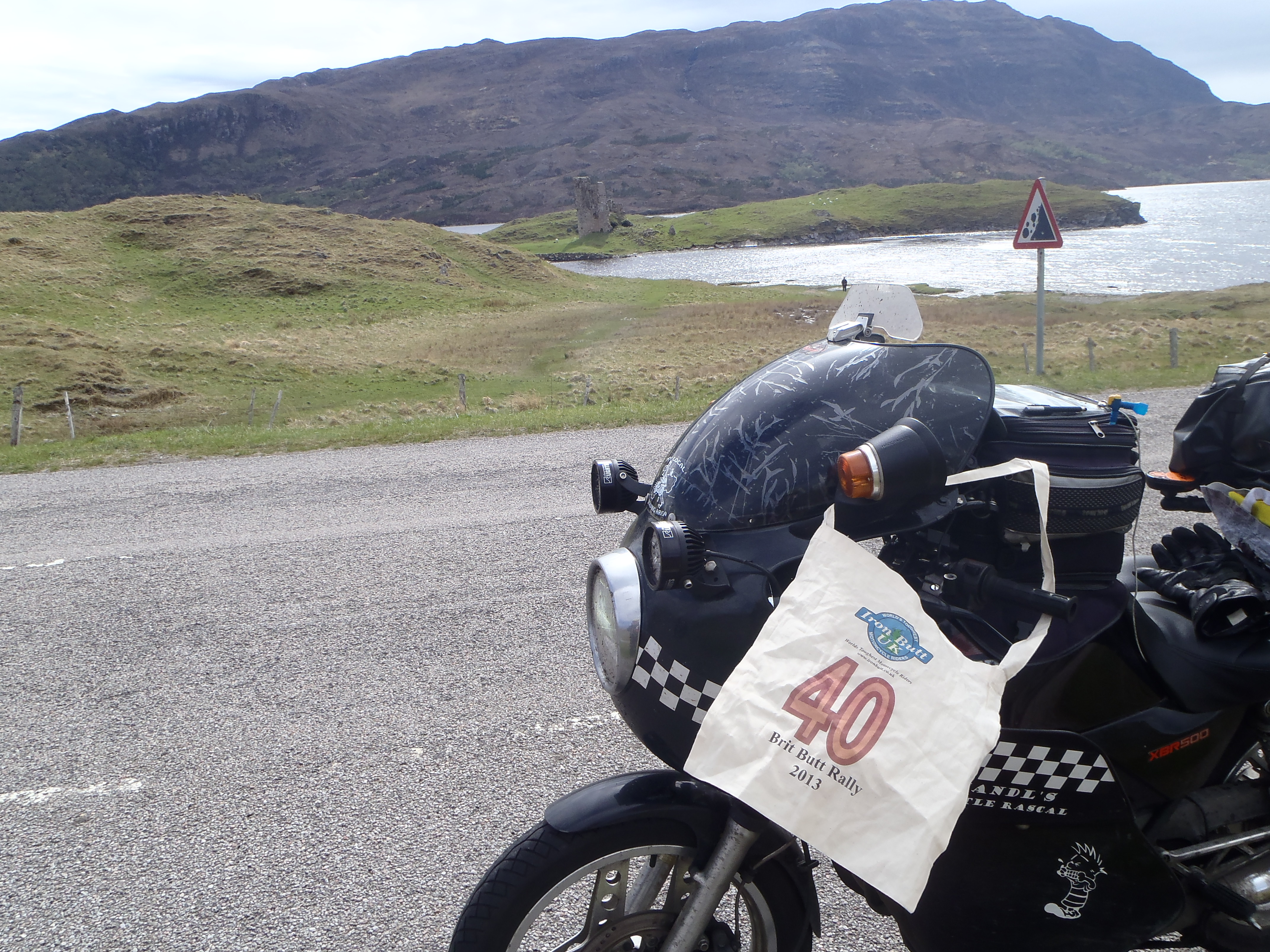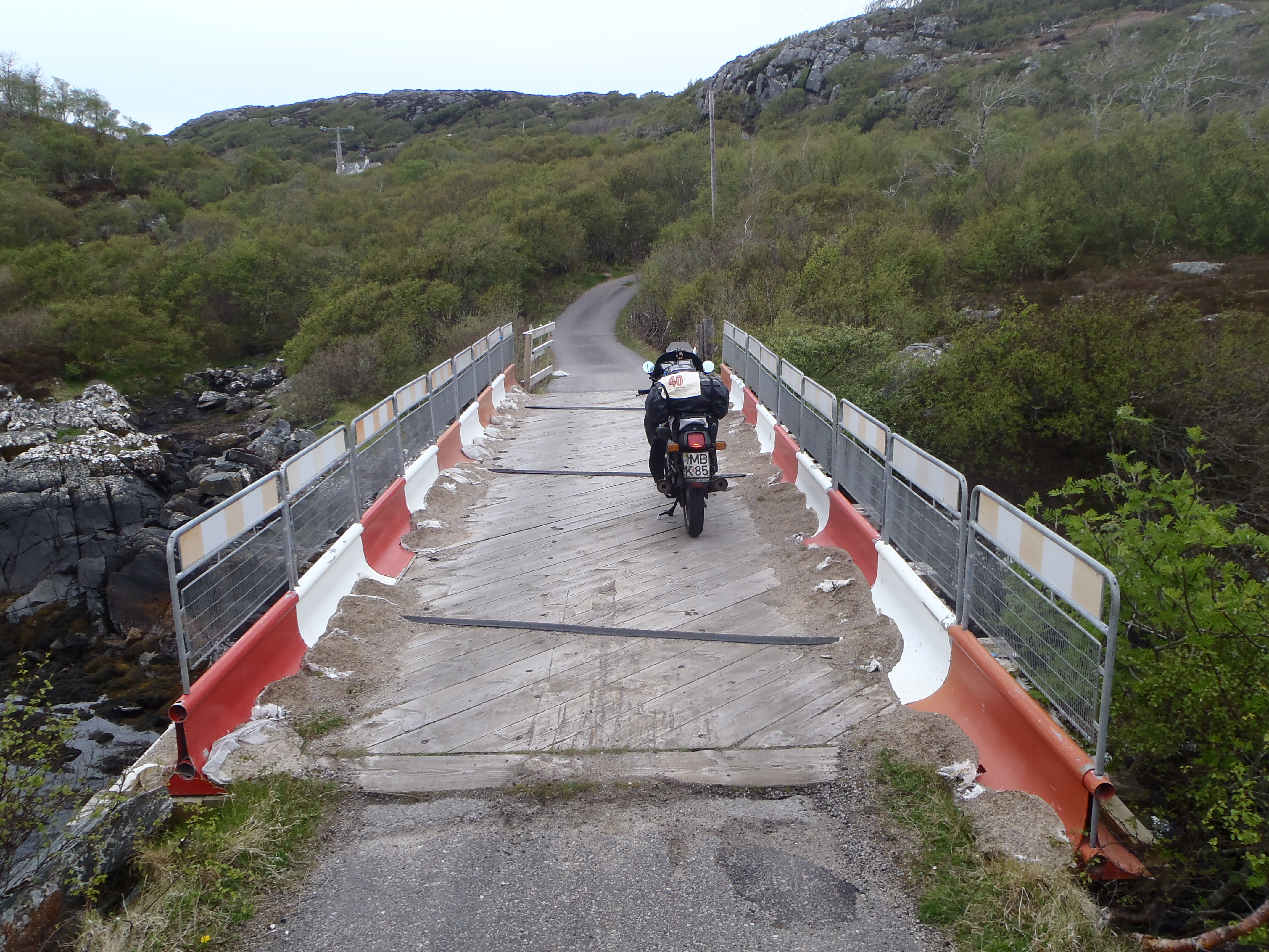 Ok, now get back carefully to the main road. I was glad to have filled harder fork oil. The fairing adds quite a lot of weight to the front wheel. But while riding the coast road, I started to like the trip more and more. Despite the handicap of the heavy fairing and the auxiliary fuel tank, the XBR behaved quite neutral. A little, black Honda blasting along the coastline. Although it was only 250 miles since the last fuel stop, I needed to get petrol in Ullapool, as further down the road it would be difficult to find a petrol station. While refuelling, a group of Spanish riders noticed my XBR and were very interested in the bike. To their surprise, I chatted in Spanish with them and they told me they came a long way from the Canary Islands for a biker meeting. When I told them about my rally, they were very impressed. At the petrol pump, I caused some petrol overflow for I didn’t realise immediately that the reason for my leaking tank was the open valve of the aux tank that still stood open. Pretty much petrol spilt, ehem. I decided to have a quick ‘lunch break’ (sandwich) and after some more chatting I continued to two more locations in the Northwest. The first was a small bridge in the middle of nowhere that took me a while to find. The respective road/path/track was not in the map so I had to approach it by using common sense until I spotted the side road.
