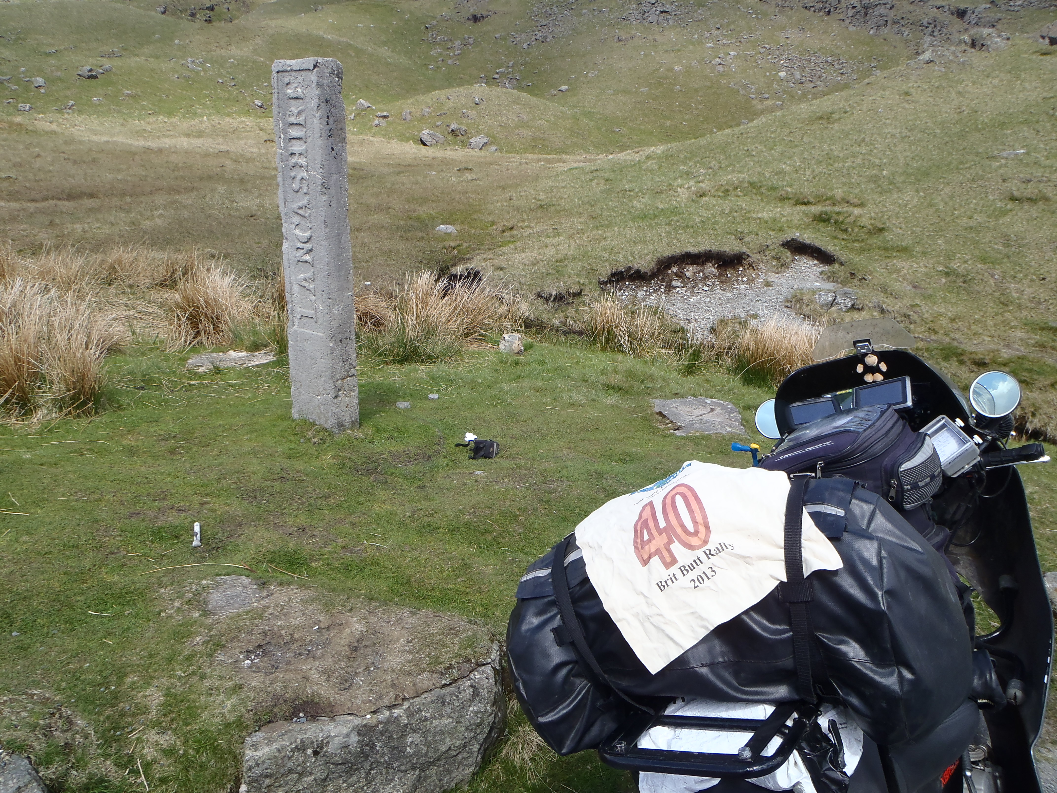 On the way back along the Wastwater Lake, I experienced for the first time something like a traffic jam. A couple of miles later I saw Rob standing at the side of the road, the helmet taken off. He looked exhausted and very frustrated. He told me that his R1150GS had lost the second and fifth gear. He was so tired to jiggle around with the gearbox that he considered to stop the rally and ride back home. I tried to cheer him up and wished him good luck. The route lead me through the mountains of the Lake District and I was puzzled by the extremely steep roads that lead me to the Wrynose Pass. Up there, I had to take a picture of the Three Shire Stone.